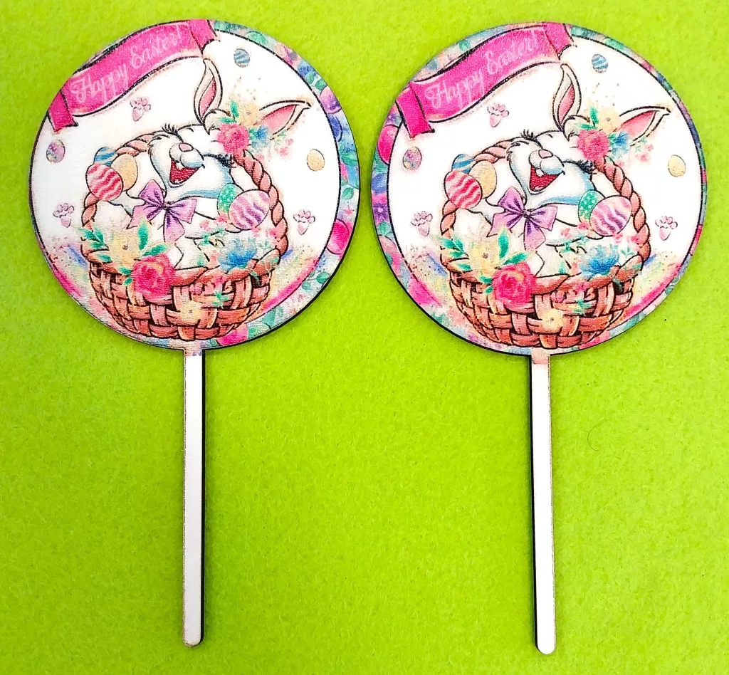 Nyomtatott Fa beszúrós dísz nyuszi kosárban Happy easter felirattal 2db/csomag 8,5x16cm