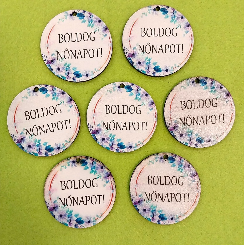 Nyomtatott Fa Kék kör lap Boldog nőnapot felirattal 7db/csomag 5cm