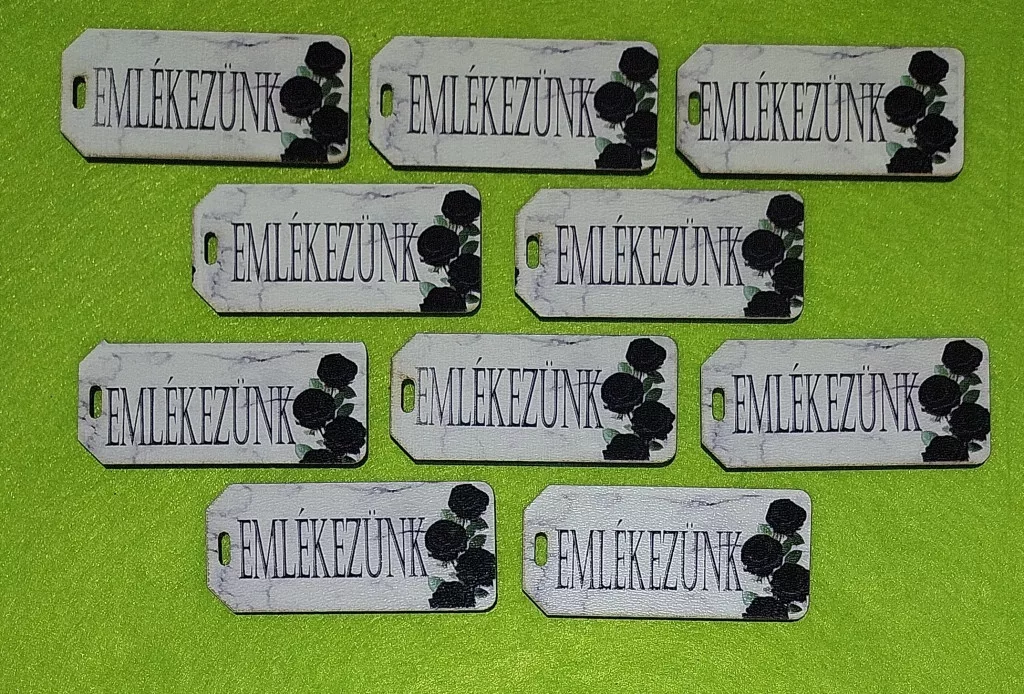 Nyomtatott Fa Biléta tábla Fehér márvány háttérrel fekete rózsás Emlékezünk felirattal 10db/csomag 5,5x2,5cm
